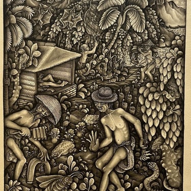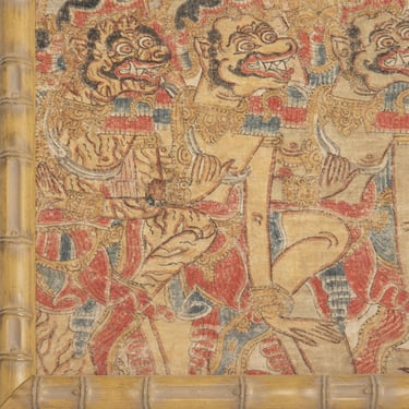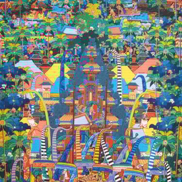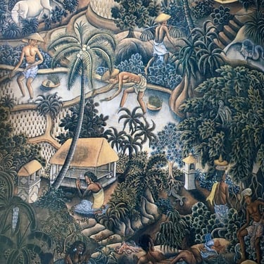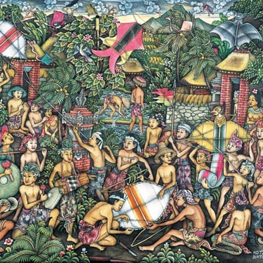 The Batuan style is known for its dark tones, crowded compositions, and mystical atmosphere. Every inch of the canvas is filled with detail, often showing religious ceremonies, temple rituals, and even supernatural events.